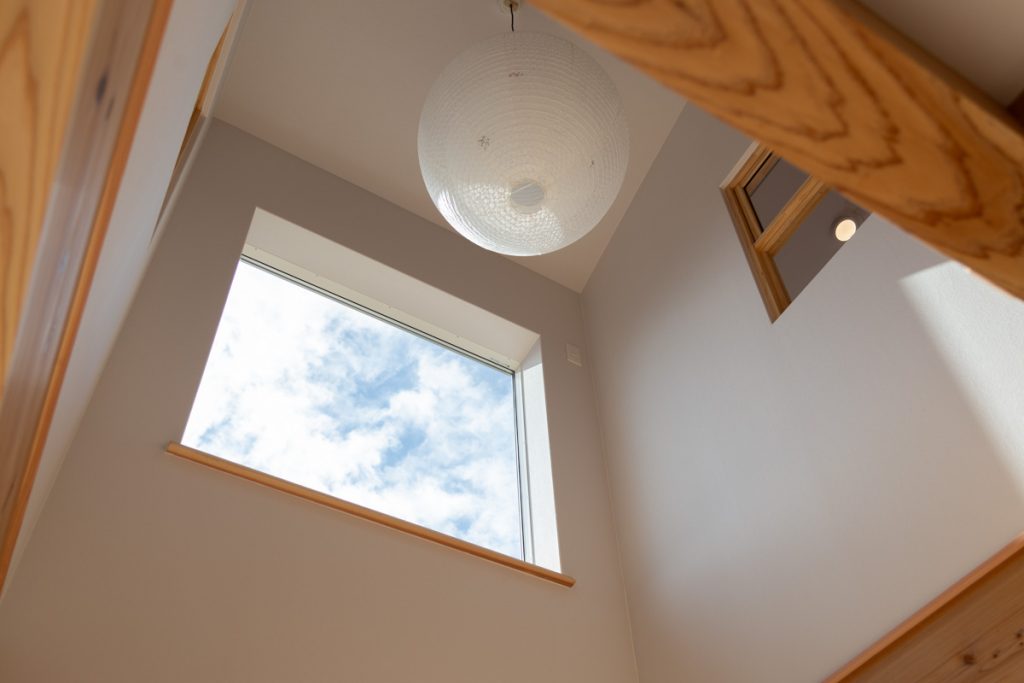 吹き抜けから上を見上げると大きな窓から空が見えます。