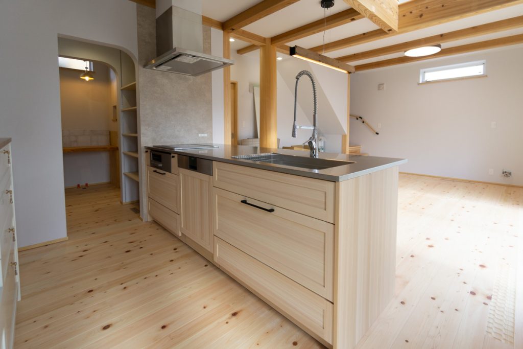 こちらはWOODONE(ウッドワン)のキッチンなんですけど、このキッチン全面ヒノキ張りの仕様は珍しいらしくて、メーカーさんが写真を撮りに来るレベルなんです。