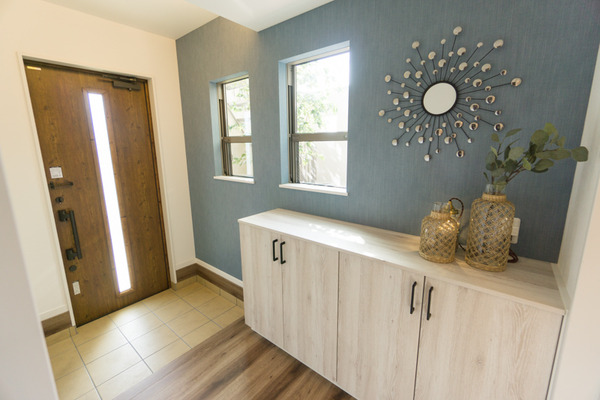 まず玄関は落ち着いた色合い。写真の左側には大きな土間収納があります。