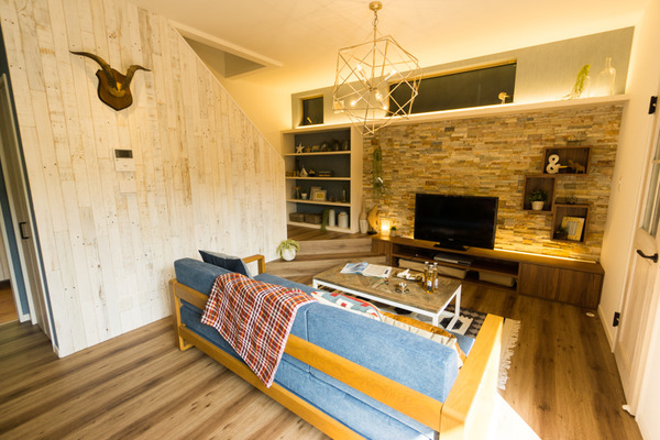 リビングは暖色の間接照明がふんだんに取り入れられ、落ち着く雰囲気です。