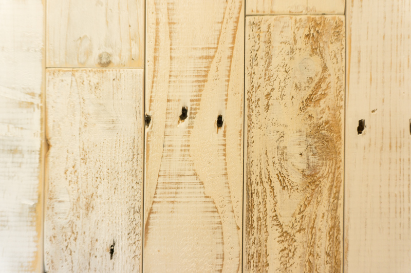 床や壁は木材(左)で、テレビ側の壁は凹凸のあるレンガみたいな素材(右)でできています。