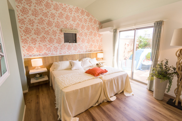 こちらも勾配天井になっていてより高く、広く感じられます。壁紙もオシャレ〜♪