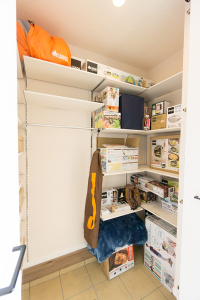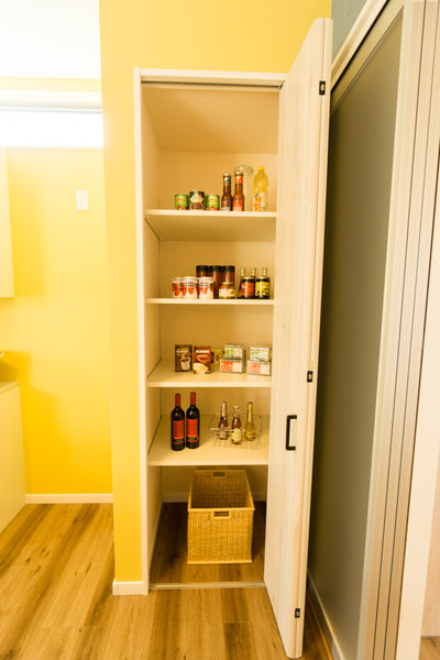 高さが変えられる大きなパントリーには保存食やお酒、食器などをたっぷりしまっておけます!やっぱりパントリーはキッチン内にあるのが便利ですね!