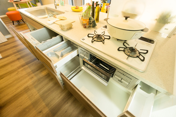 対面キッチンでは、家族との会話を楽しみながら料理できます。奥は先ほども出てきた半屋外空間の「ロジア」!あとで改めて見て行きますよ〜