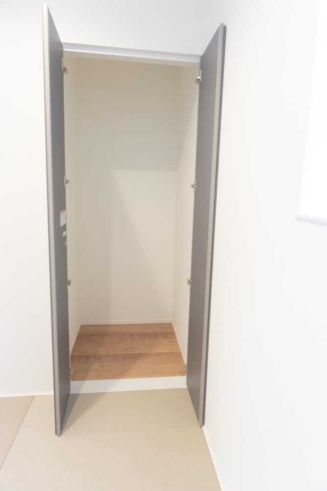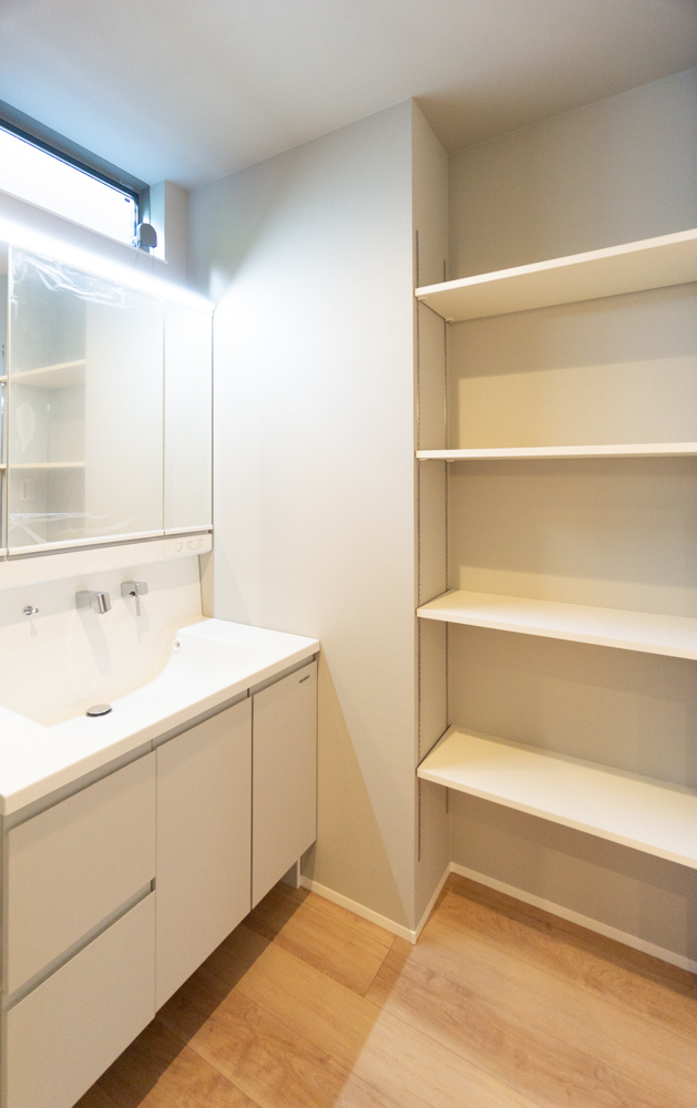 大きな収納棚があるから、タオルなんかもストックしておけますね。