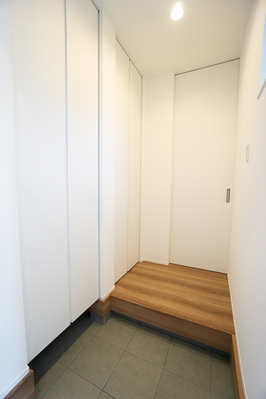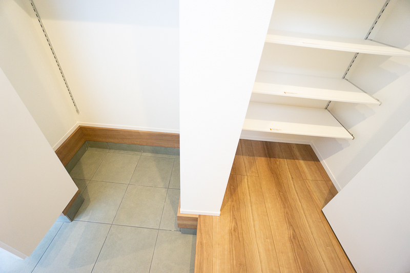 家族の靴はもちろんベビーカーや雨具、外で使うものもまとめて家の中にしまっておけます。