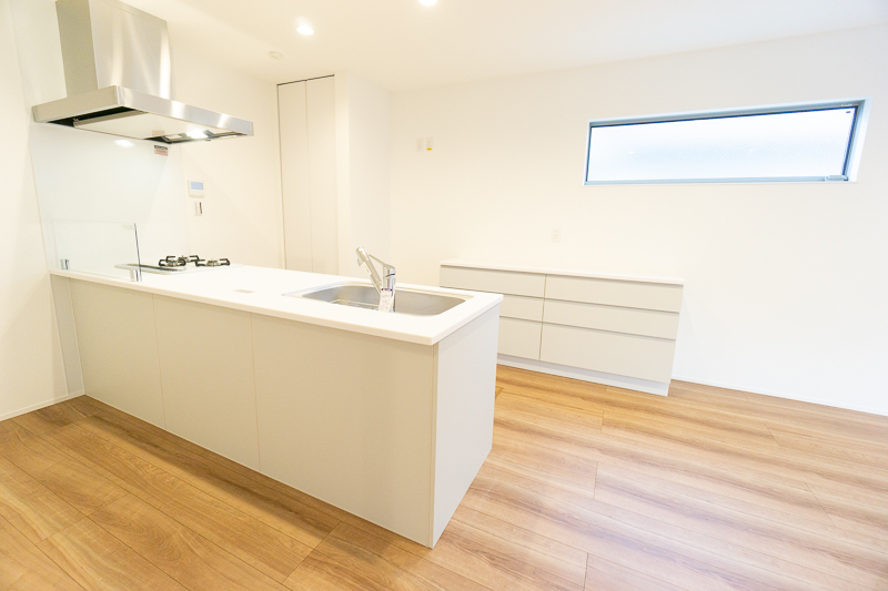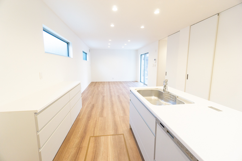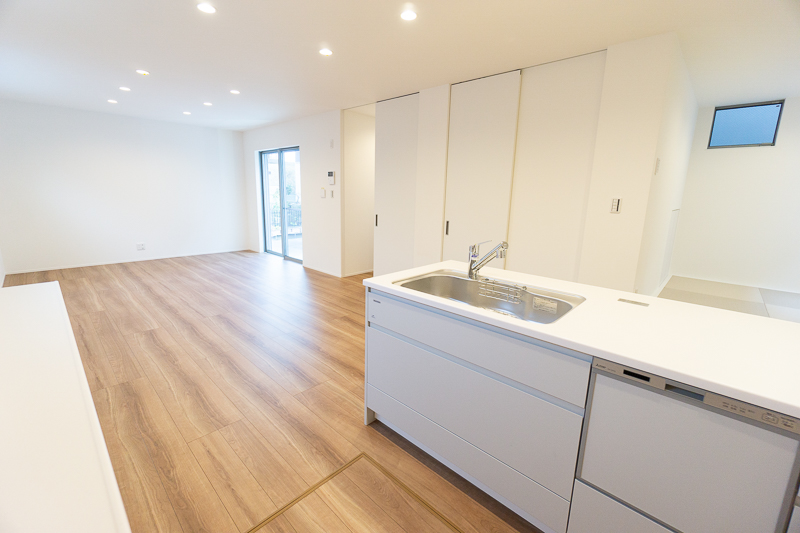 わー!キッチンを縦に配置してあることでめちゃめちゃ空間が広く感じますね!