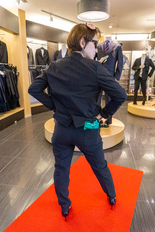 スーツに後ろポケットは普通ですけど、おもちゃの鉄砲入れてる人ってなかなか見ませんけどね(笑)