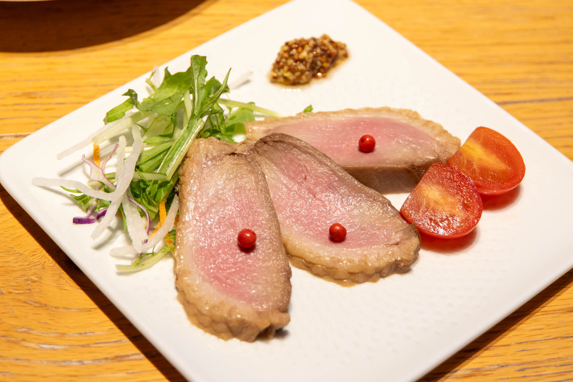 肉料理は鴨、お魚は新鮮なお造り3種と、どれも罪悪感なく楽しめる品揃えながら、味も見た目もとても素晴らしく、コースメニューを眺めながら『次はどんな一皿がくるんだろう?』とワクワクが続く構成。食べ終えたあとは十分な満足感がありつつも重たさが残らず、最後まで疲れずに楽しめる、とても心地よいコースでした!