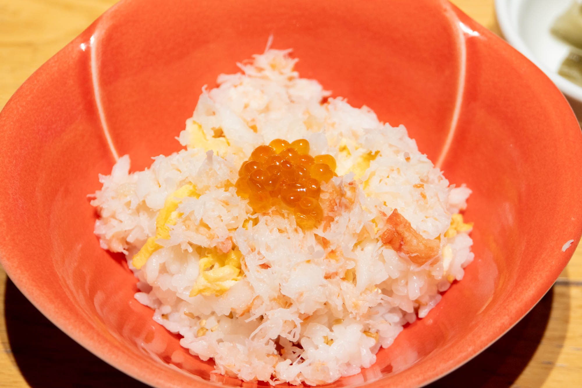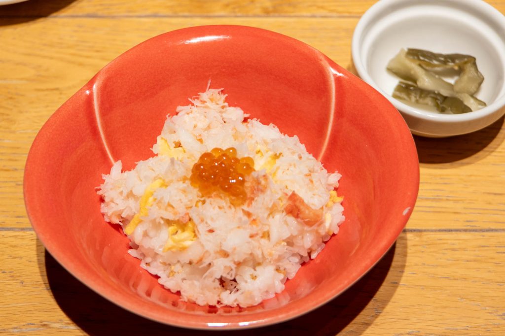 そしてコースの締めにふさわしい、ずわい蟹のミニちらし寿司(堪能コース)と鯛の釜めし(こだわりコース)。