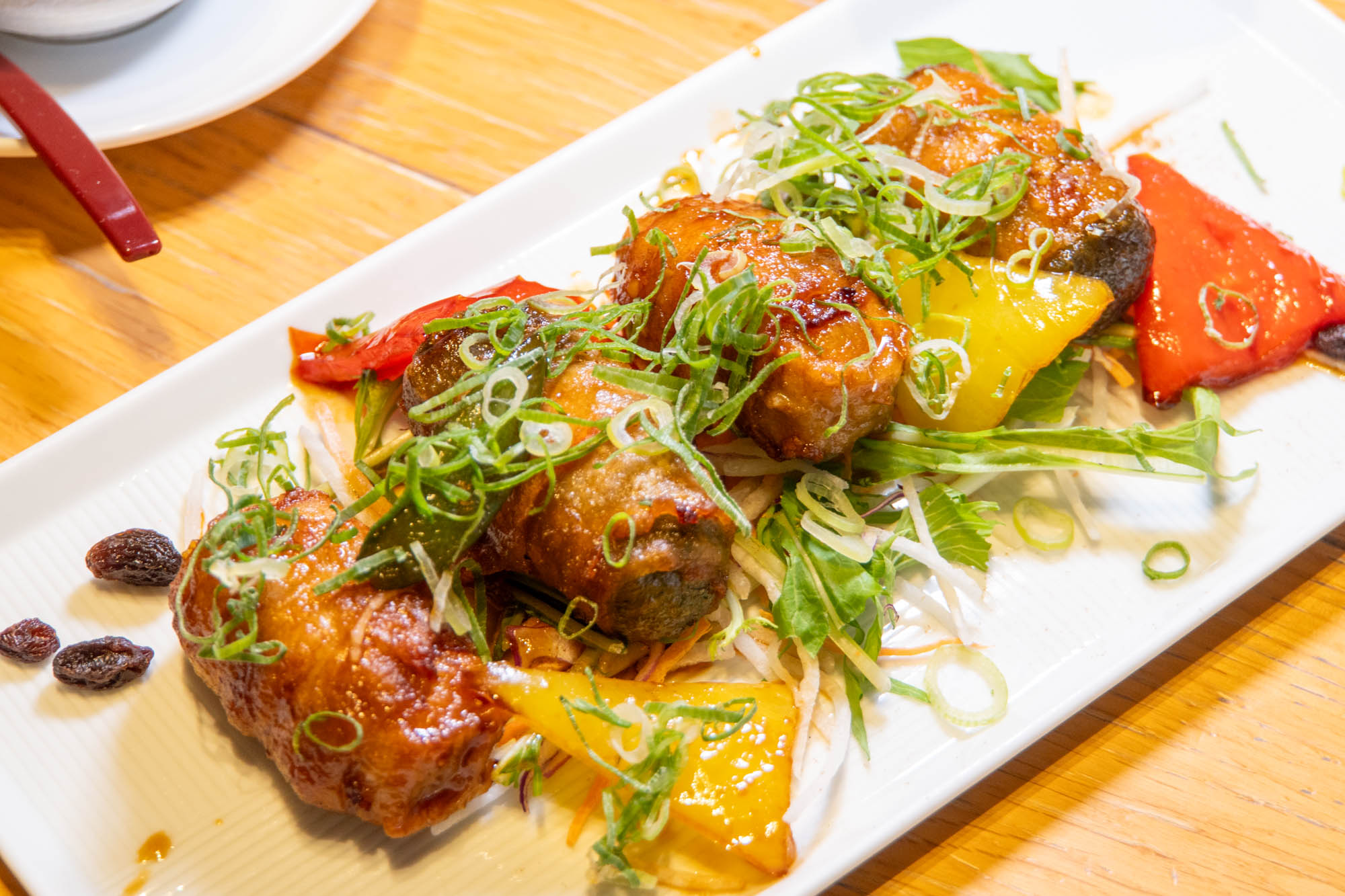こちらはどちらのコースも共通の「2種の生麩の豚バラ巻き」。
