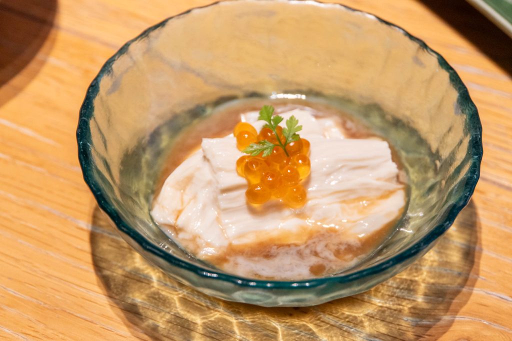 どちらのコースにも共通する最初の一品「たぐり湯葉 いくら添え」。数あるコース料理のなかで特にトリーの印象に残った一品だったようで…