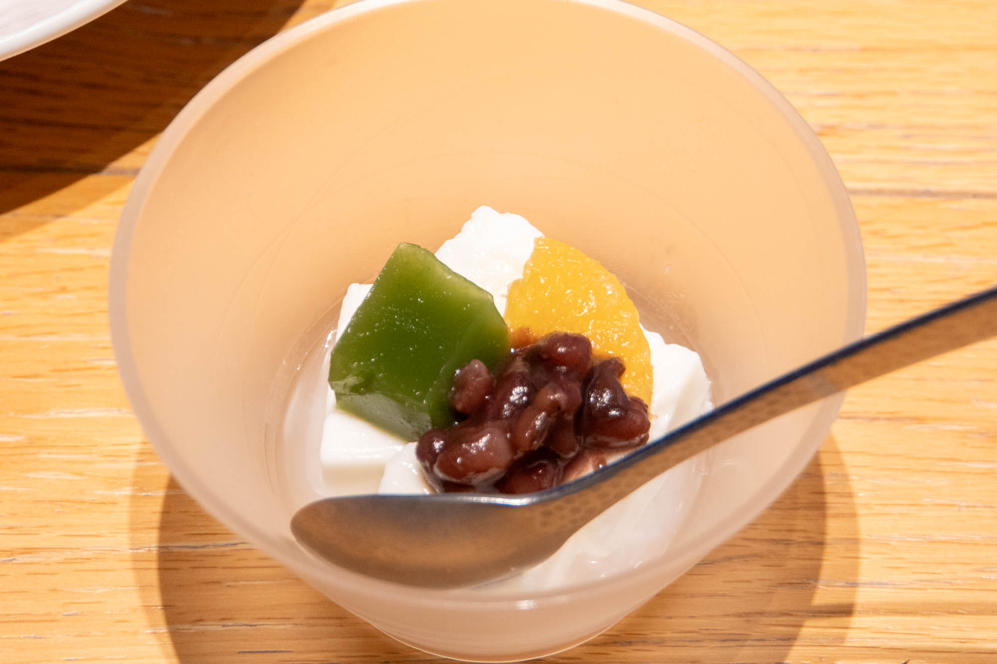 「ゼリーでもない、お餅でもない、弾力もありつつぷるんとした食感もあり、これはなんだろうと思っていたんですが、葛粉を使用していると聞いて納得!この絶妙な食感がめちゃくちゃ美味しい!ミルクのまろやかな甘さに小豆と抹茶がぴったりです!」
