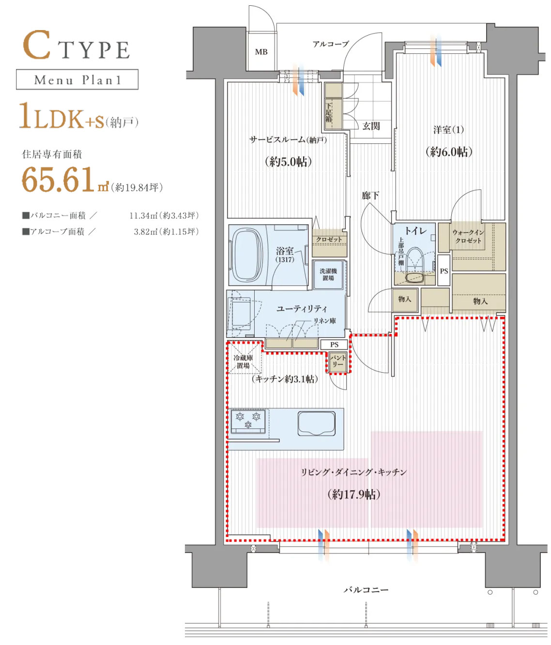 こちらのお部屋は1LDK+S(納戸)で、リビング・ダイニング・キッチンを広くとり約17.9帖の開放的な空間にしたプランです。