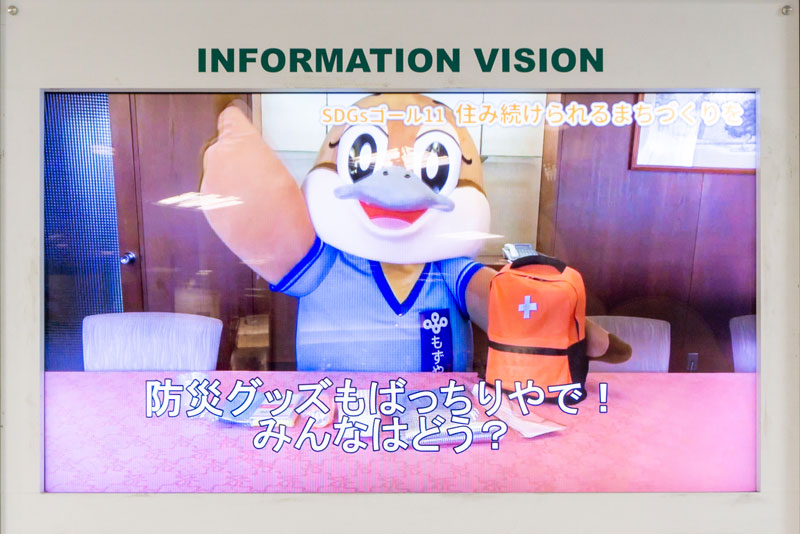 サイネージではSDGsの17の目標について、もずやんが具体的な事例を紹介してくれています。