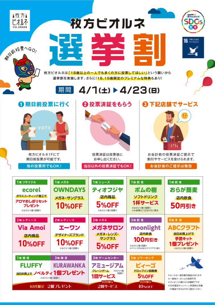【イベント】枚方ビオルネ選挙割 各対象店舗 ※4月23日(日)まで