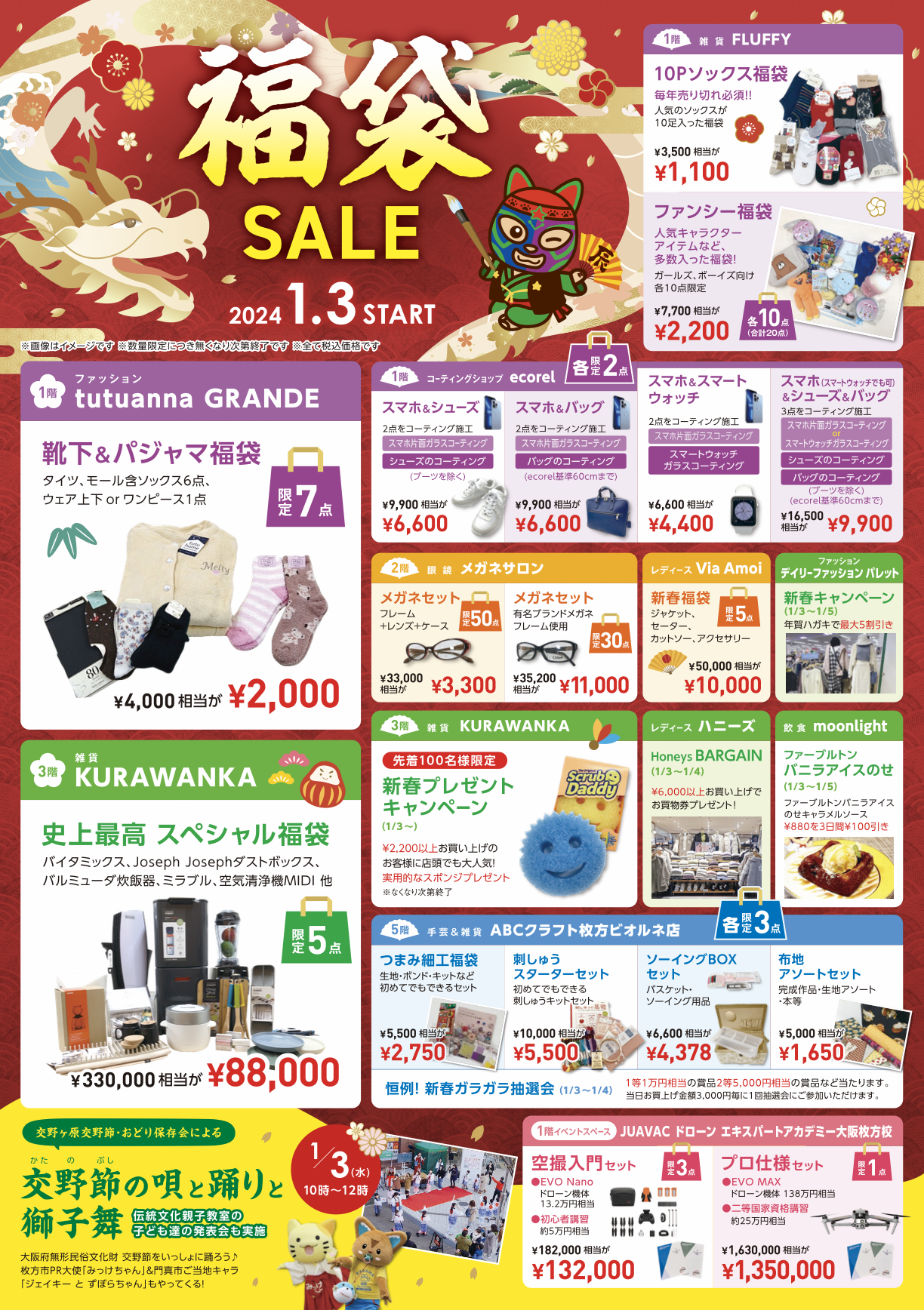 2024年福袋の中でもちょっと目を引くのが、「JUAVACドローンエキスパートアカデミー大阪枚方校」の“空撮入門セット”や“プロ仕様セット”。