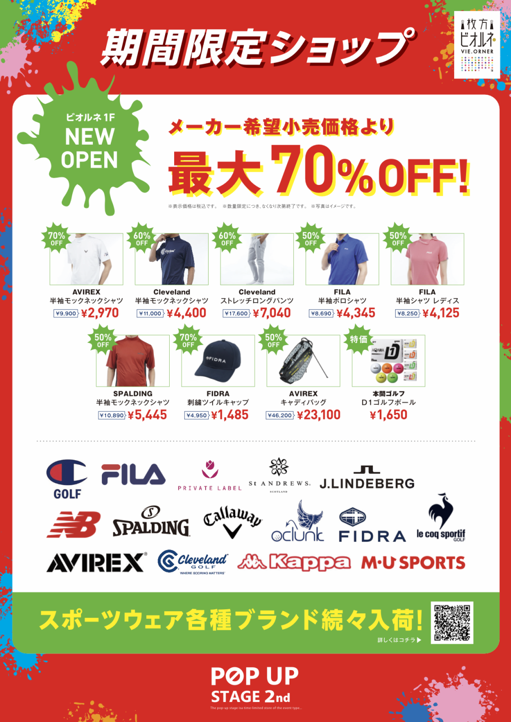 期間限定ショップ「POP UP STAGE 2nd」 営業時間 10:00〜20:00 取り扱いメーカー/ブランド SPALDING、PRIVATE LABEL、M•U SPORTS、le coq sportif、 Kappa、KANGOL、FILA、FIDRA、oclunk、Cleveland など 関連リンク 枚方ビオルネHP イベント・キャンペーンページ