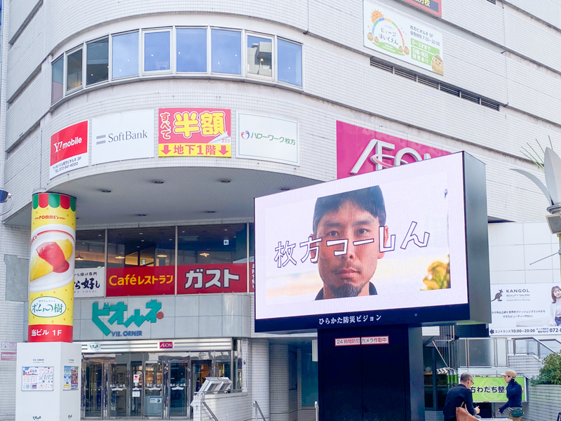 枚方ビオルネ前にある大型ビジョンでは、毎日ニュース・天気・行政・消防・警察などによる生活情報、各種イベント、エンタメ情報などを配信中。