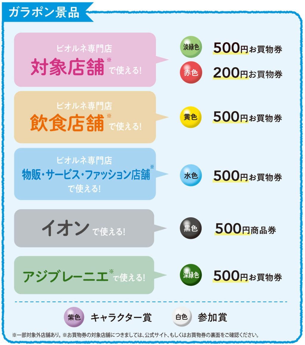 ビオルネ専門店やイオン、アジブレーニエでも使える500円お買物券、200円お買物券(ビオルネ専門店の対象店舗のみ)、キャラクター賞、参加賞 ※ハズレなし!