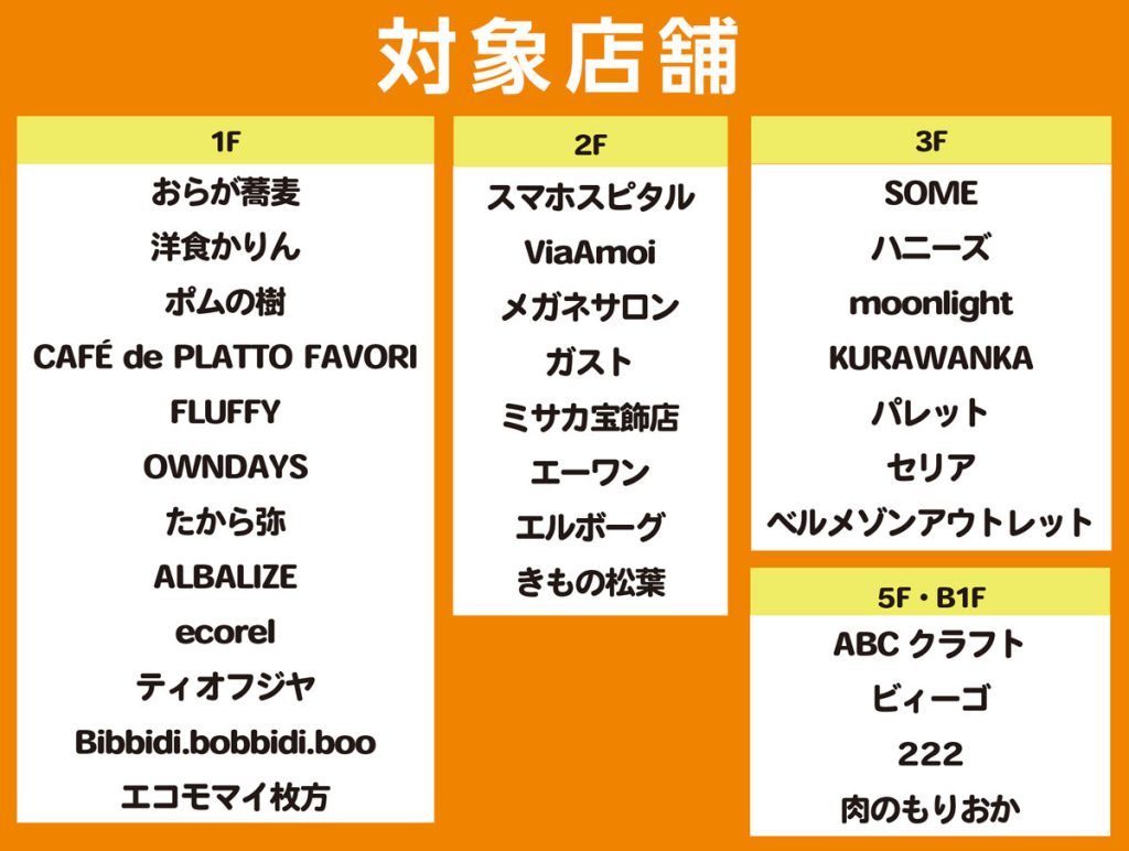 セリアやライフスタイル雑貨店KURAWANKA、パレット、ハニーズなどの服飾店、他にもシールやシール帳の販売もしているFLUFFY(フラッフィー)なども対象◎