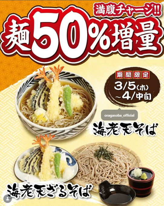 おらが蕎麦ではただいま、「満腹チャージ!! 麺50%増量キャンペーン」開催中!