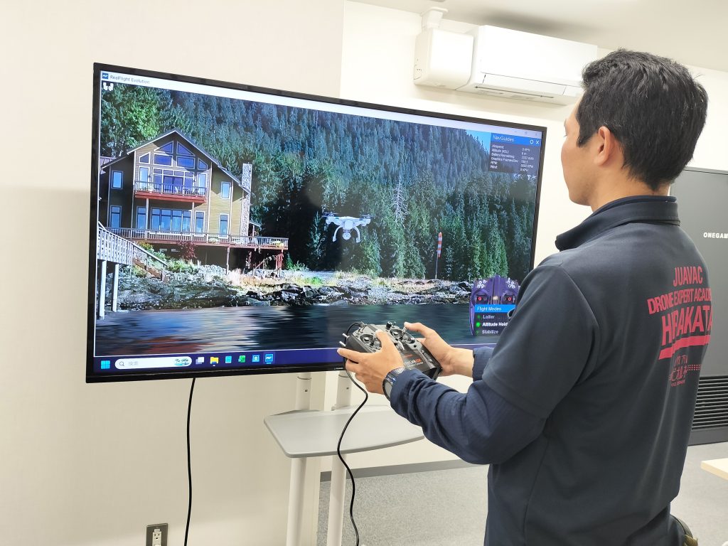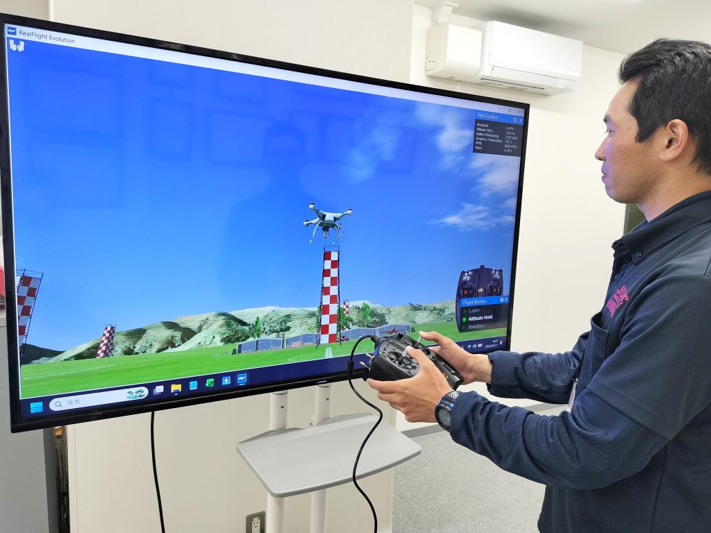 操縦体験ではドローンレースや国家資格の試験コースを大型モニターで体験できます。