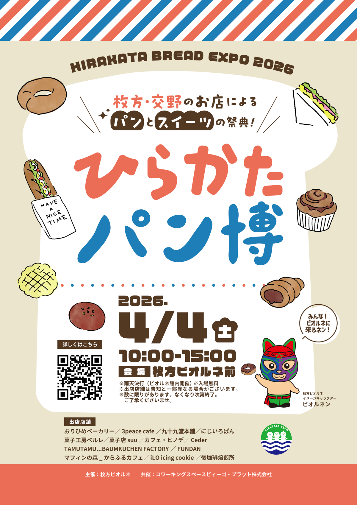 枚方・交野・寝屋川など地元のパン屋さんをはじめ、スイーツやカフェなどの個人店13店舗が集結!