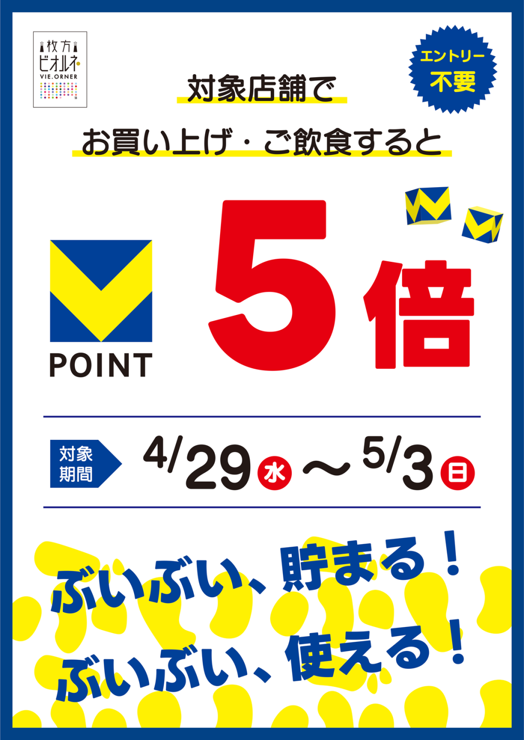4月29日(水・祝)〜5月3日(日)に、対象店舗でお買い物・ご飲食するとVポイントが5倍もらえます!
