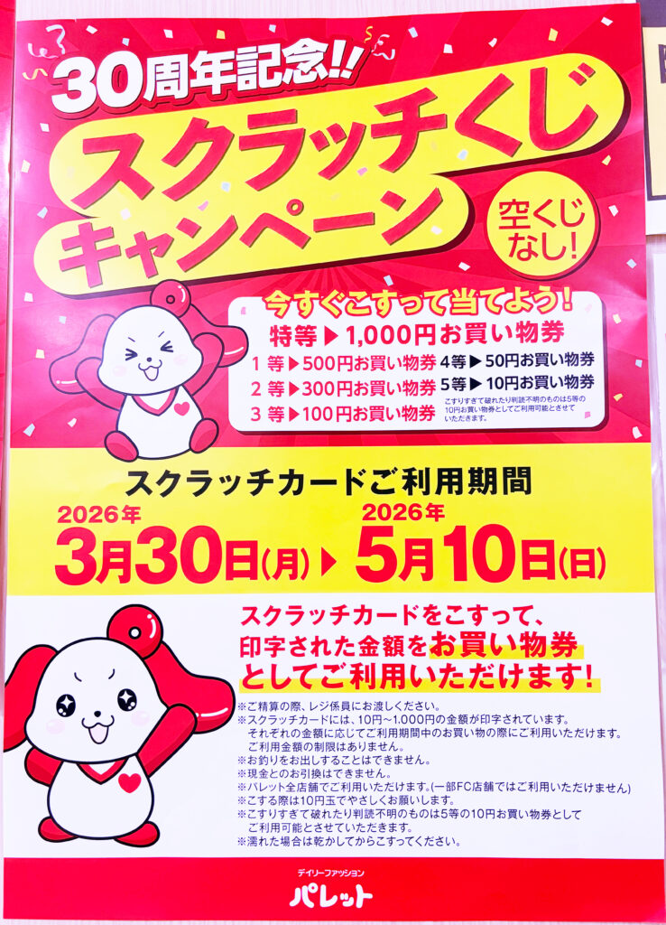 パレットでは、空くじなしの30周年記念!!スクラッチくじキャンペーンを開催中!
