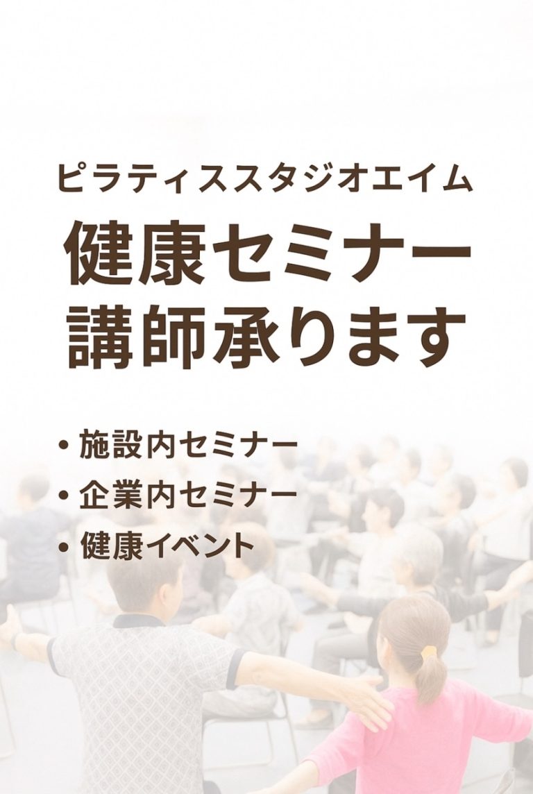 ■ ピラティススタジオエイムの健康サポート 当スタジオでは、地域の皆さまや企業の皆さま向けに、ワークショップ・施設内健康セミナー・企業内健康セミナーの講師を承っております。 ピラティスを通じて、姿勢改善・呼吸改善・体幹強 […] -