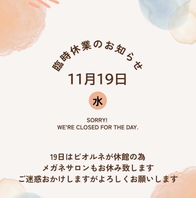 【臨時休業のお知らせ】11月19日(水)は休業いたします👓|Opticalメガネサロン(オプティカル)