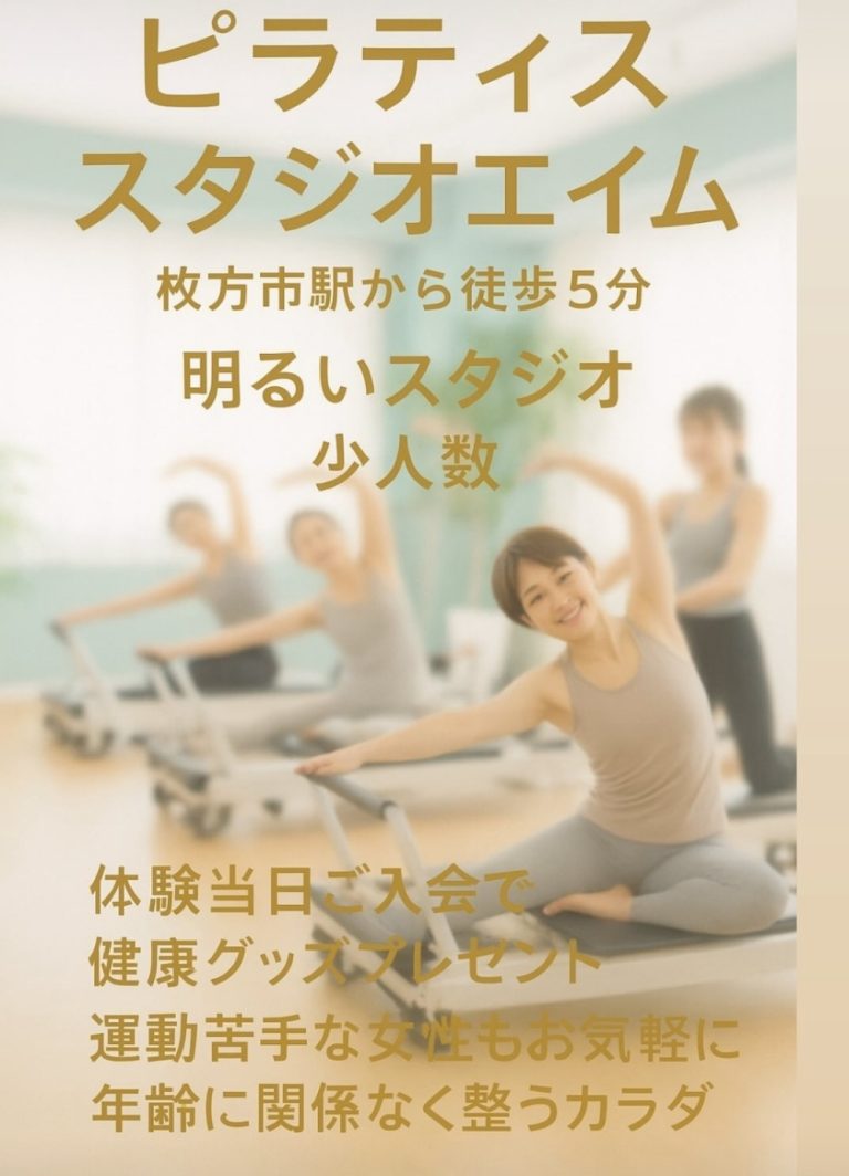 「枚方市駅徒歩5分女性専用マシンピラティスで、姿勢も呼吸も整える」体験当日ご入会で健康グッズプレゼント|Pilates studio aim(ピラティススタジオ エイム)