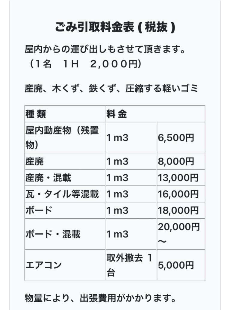 ■ ごみ引取料金表を公開しました 当社のごみ引取サービスの料金表を新たに公開いたしました。 屋内にある重たいお品物や動かしにくいものも、作業員が屋内から運び出しまで対応いたします(作業員1名1時間あたり2,000円)。 […] -