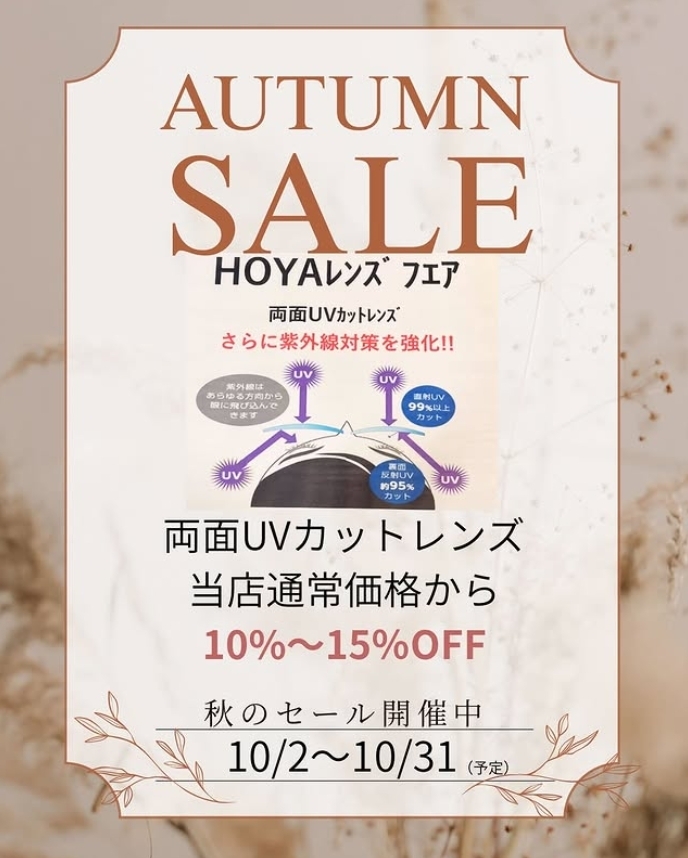 秋のセール開催中!HOYA両面UVカットレンズが10%〜15%OFF ビオルネ枚方2階 Opticalメガネサロン|Opticalメガネサロン(オプティカル)