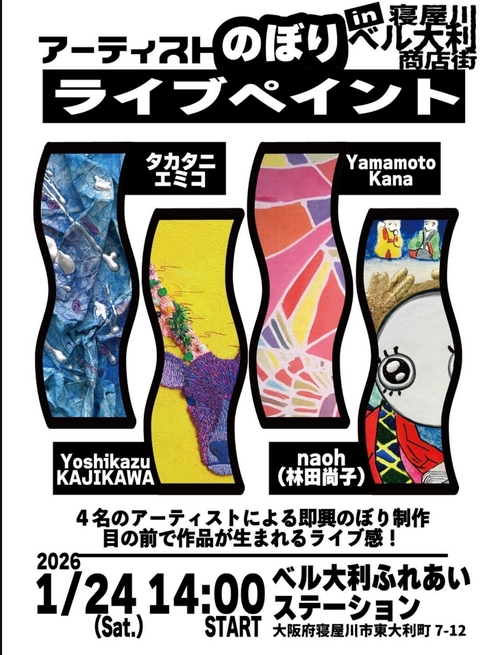 ベル大利商店街にある「ベル大利ふれあいステーション」で、アーティストのぼり ライブペイントを開催します! 4名のアーティストがその場で即興で「のぼり」を描き上げる、臨場感たっぷりのイベントです。 ■ 開催日時・場所 【日 […] -
