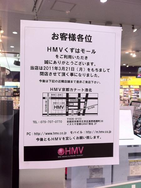 くずはモールの3階にあるCD・DVDのお店「HMV」が3月21日で閉店するそうです。店頭に貼り紙がありました。お客様各位HMVくずはモールをご利用いただき誠にありがとうございます。当店は2011年3月21日(月)をもちま […] -