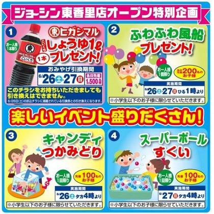 26日(土)ジョーシン東香里店オープン。チラシ持参でしょうゆ1リットルもらえるそうです。
