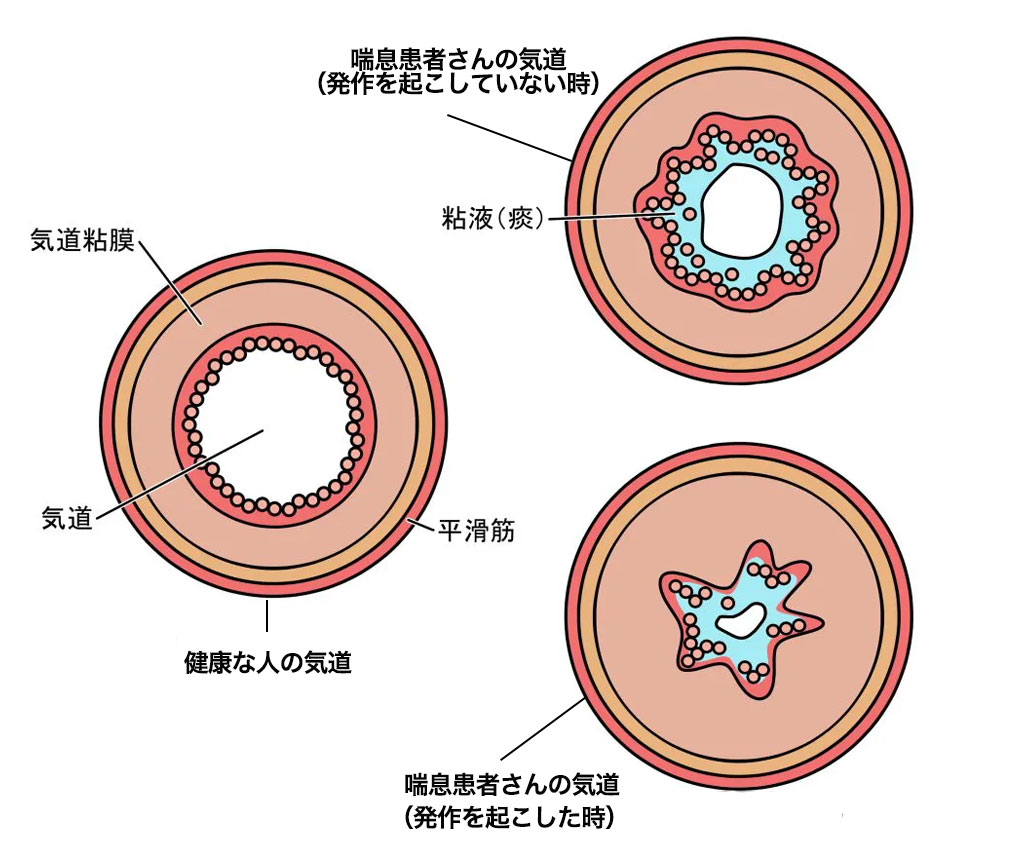 気管支喘息は、気道(空気の通り道)に慢性的な炎症が起きる病気です。