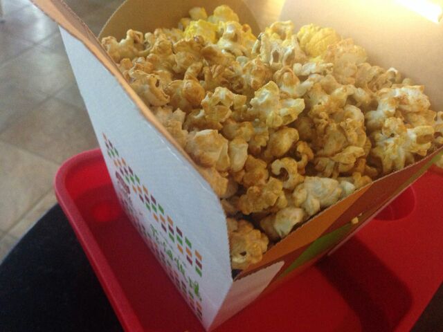 チケット購入時にもらったポップコーン大盛り券を渡すと、こーんな大きいものが貰えます!キャラメルの濃厚な甘さとサクサク食感、チーズの豊かな風味が絶妙にマッチしていて、とてもおいしいです!是非ご賞味ください。