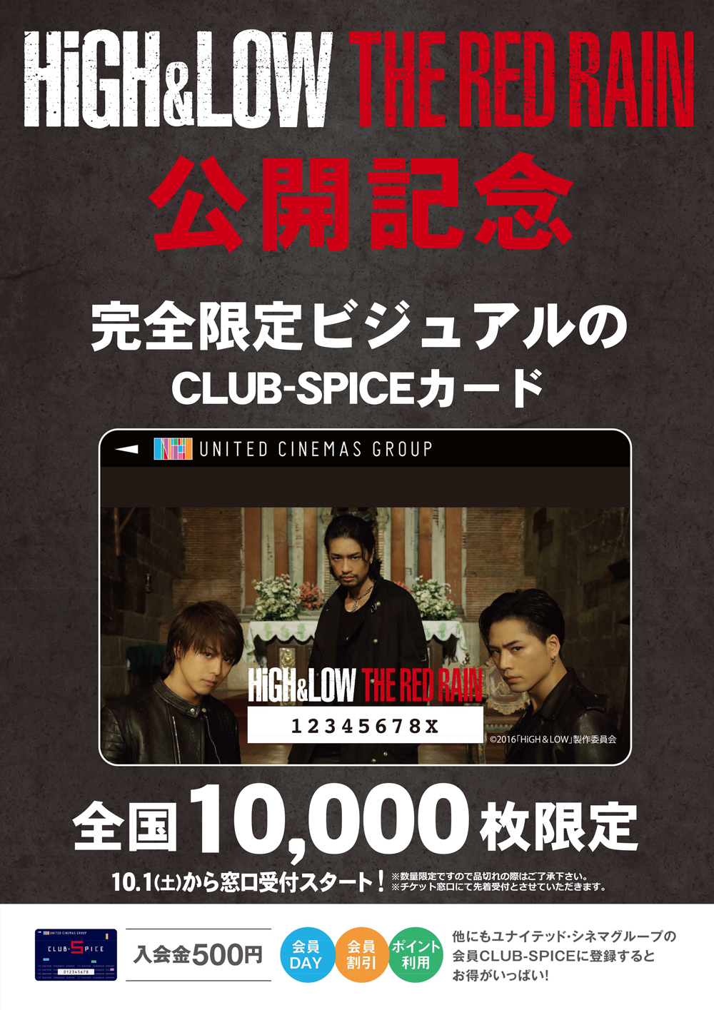 明日10/1より「HiGH&LOW THE RED RAIN」公開記念限定ビジュアルのCLUB-SPICEカードを販売いたします!全国限定10,000枚のプレミアムカードは完売必須。EXILEファンの方はもちろん、人と差をつけたいあなた!まだメンバーズカードを持っていない君!是非、劇場チケット売り場にて手に入れてくださいね!!