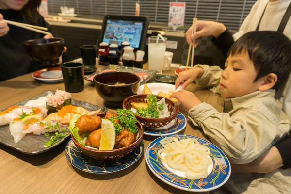 ちびシュンはお寿司よりもからあげ・ポテト・うどんのほうが口に合うようす。