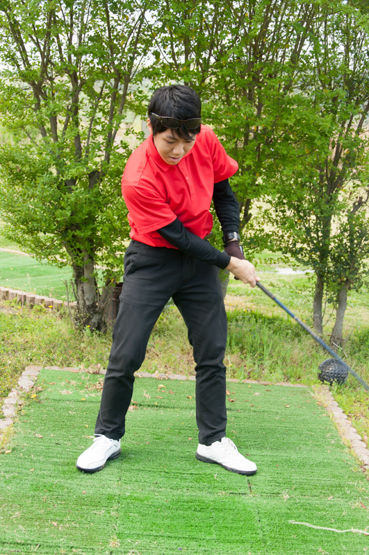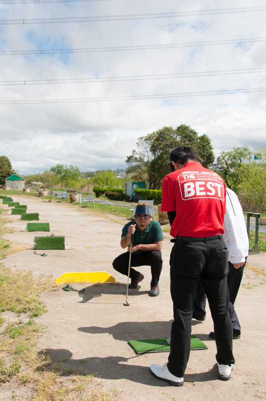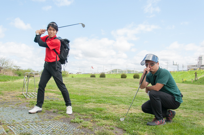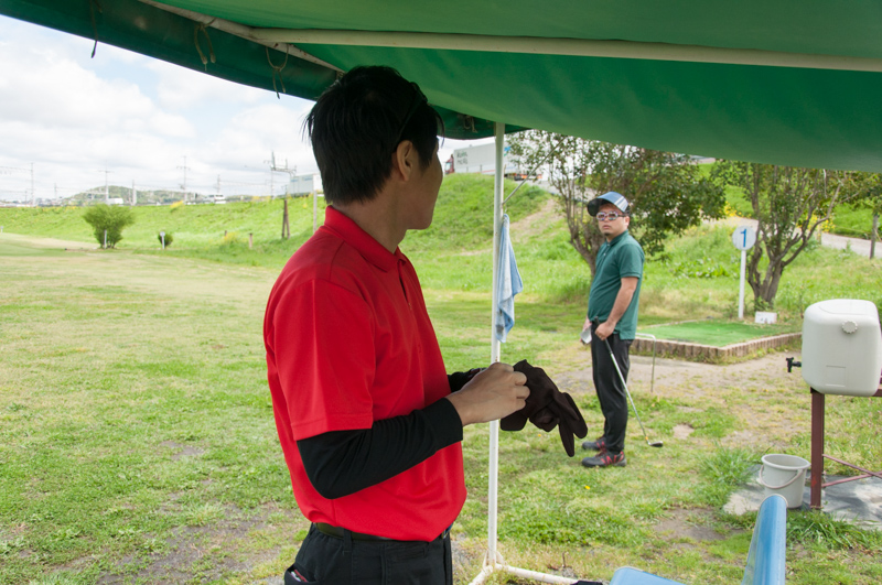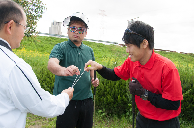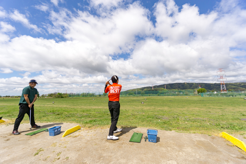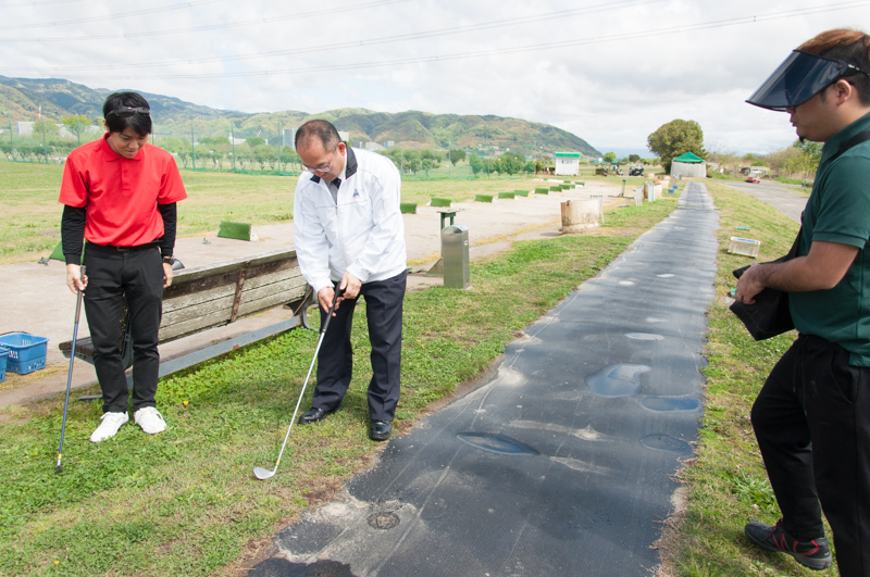 2人共初心者ということもあり今回は特別に、藤野支配人にクラブの握り方と振り方を簡単に教えていただきました。