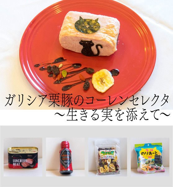 →甘く芳醇な香りとふわっとした食感が特徴的な「くり豚ランチョンミート(459円税込)」に、簡単にお弁当を猫でデコれちゃう「ネコのりあーと(313円税込)」を使用。ちなみにコーレンセレクタは料理名かと思って名付けたんですが、くり豚ランチョンミートを作ってるメーカー名でした(笑)