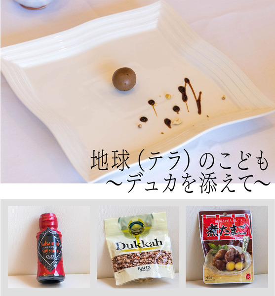 サラダからお肉、魚まで何にでも合うと評判のKALDIオリジナルの「バルサミコ醤油(367円税込)」を煮たまごの隣に垂らして、アラブ発祥のスパイス&ナッツ「デュカ(417円税込)」を添えたアンティパスト(前菜)です。