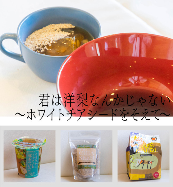 →洋梨がたっぷりはいったゼリー「ラ・フランスミックスと紅茶のジュレ(145円税込)」に、普通のチアシードではなく、白い「オーガニックホワイトチアシード(980円税込)」を散らしました。