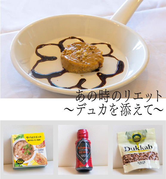 →ワインにもピッタリ合い、おつまみとしても優秀な「サバのリエット 瀬戸内レモン風味(248円税込)」に、サラダからお肉、魚まで何にでも合うと評判のKALDIオリジナルの「バルサミコ醤油(367円税込)」とアラブ発祥のスパイス&ナッツ「デュカ(417円税込)」を添えた魚料理です。