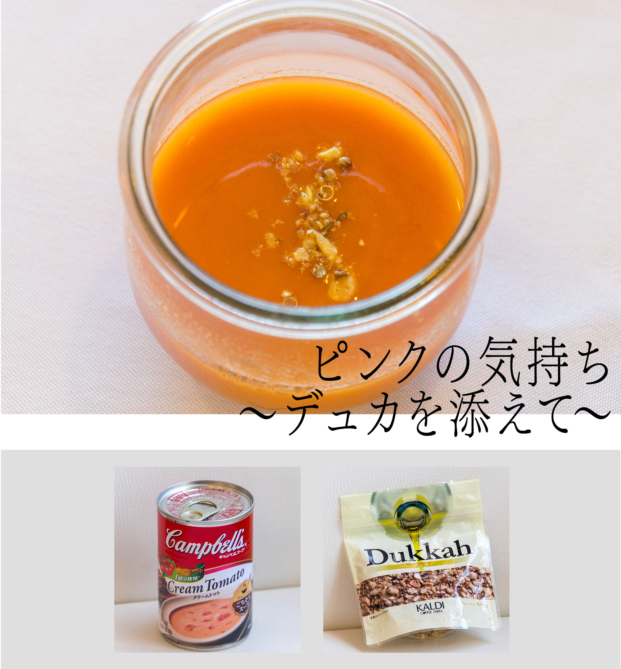 →人気ブランド、キャンベルの「キャンベルスープ クリームトマト(224円税込)」を使用し、アラブ発祥のスパイス&ナッツ「デュカ(417円税込)」を散らして食感にアクセントを加えたスープです。