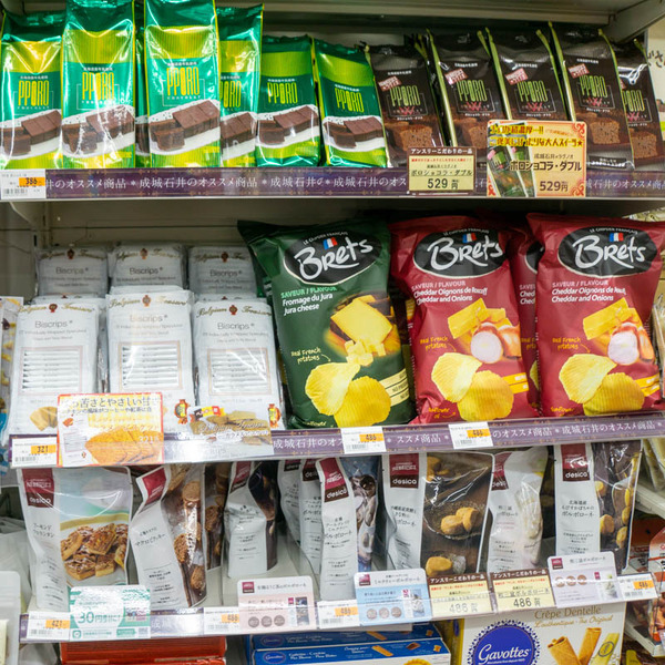 ラグノオと成城石井のコラボ商品「ポロショコラ・ダブル」(529円)というチョコレートケーキや海外のポテチやクッキーがズラッと。