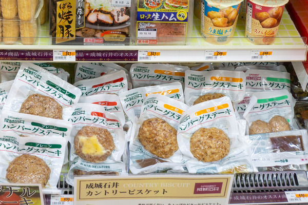 冷蔵コーナーには成城石井のハンバーグ4種、カントリービスケット、ピザが。